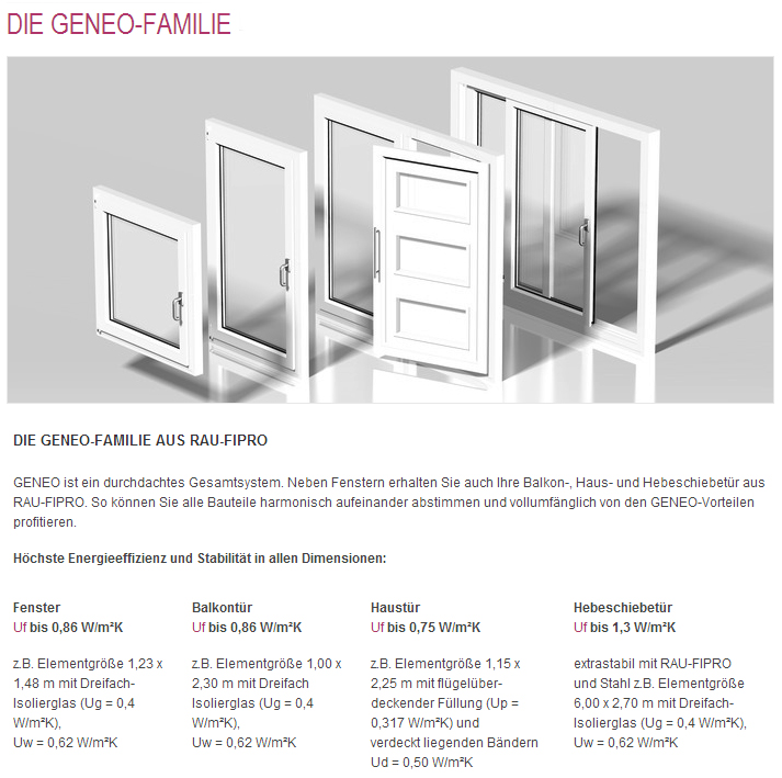 Profilkern RAU-FIPRODort, wo andere an ihre Grenzen stoßen, eröffnet GENEO neue Wege. Durch die große Stabilität von RAU-FIPRO, dem ersten Faserverbundstoff im Fensterbereich, können Fensterflächen großzügiger geplant und realisiert werden. Der patentierte Profilkern aus dem Faserverbundwerkstoff RAU-FIPRO gibt dem GENEO Fenster maximale Stabilität. Das macht bei bis zu 90% der Anwendungen einen Entfall der Stahlarmierung und somit höchste Wärmedämmung ohne Kompromisse möglich. |